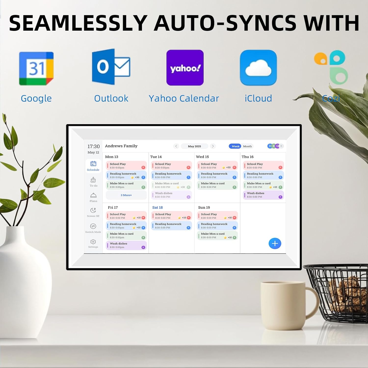 - The Hub Where Love Organizes: Mount it in the kitchen or stand it on your desk – this 15.6" touchscreen becomes your family’s command center. Features alarm setting, to-do lists, and a clear monthly/weekly schedule view – perfect for busy families.With 14 languages, sleep mode & wall-mount, it adapts to your home’s rhythm.