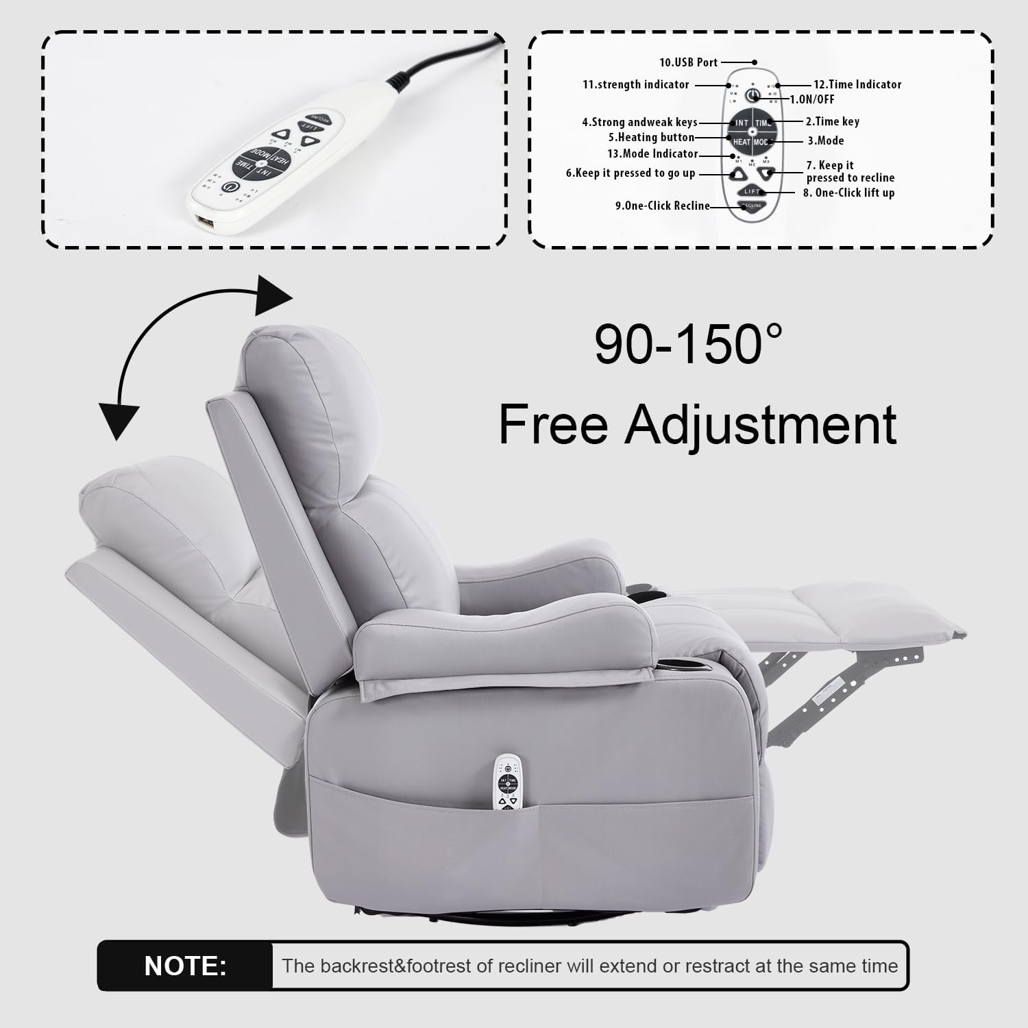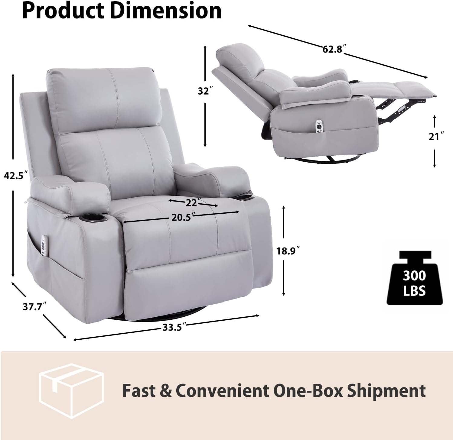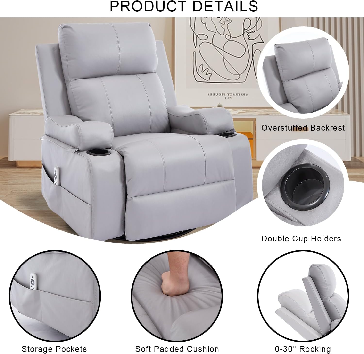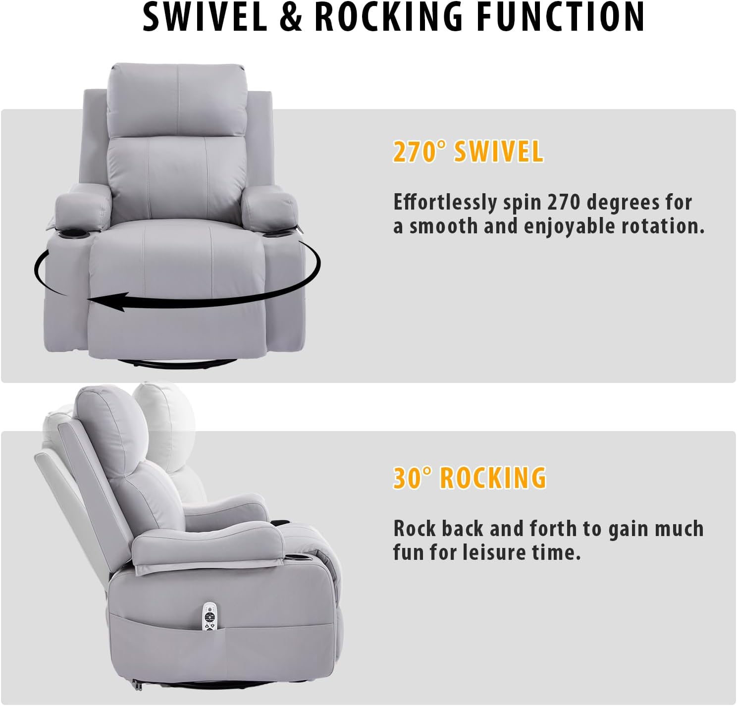 KCQ Electric Massage Swivel Rocker Recliner Chairs with Heat Cup Holders Overstuffed PU Leather Power Rocking Glider Chairs Reclining Lounge Chair for Adults, Grey